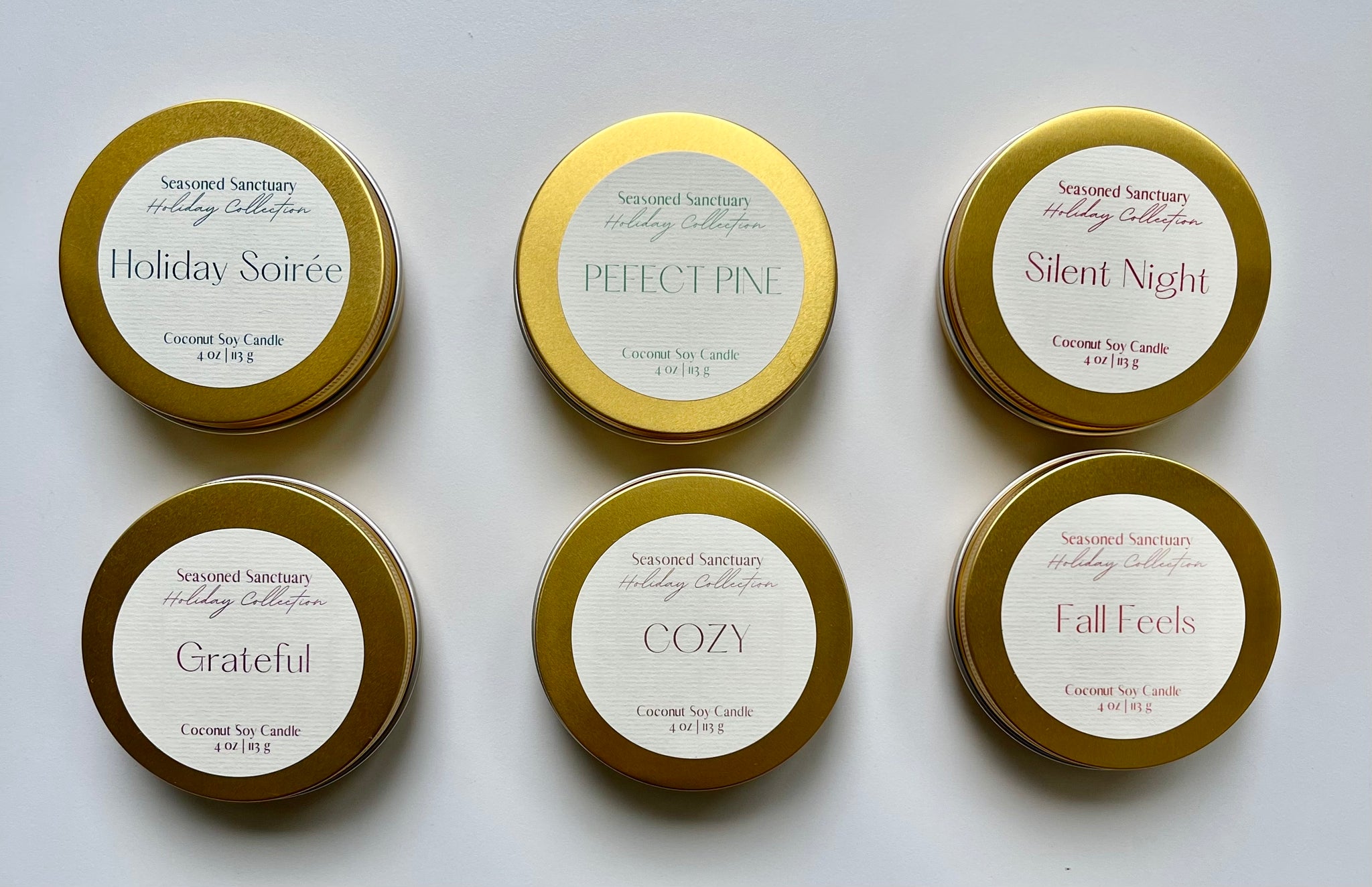 4oz single wicked tins - (1) Cozy (1)Fall Feels (1)Grateful (1) Perfect Pine (1)Silent Night (1)Holiday Soirée
